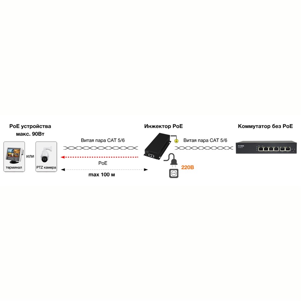 Инжектор PoE предназначен для передачи питания по сети Ethernet по стандартам Power over Ethernet IEEE 802.3af/at/bt (PoE/PoE+/HiPoE). Мощность PoE на выходе до 90Вт. Питание по технологиям PoE, PoE+ и HiPoE используется для питания различный сетевых устройств: IP-камер, Wi-Fi точек доступа, IP-телефонов и других. Мощность до 90Вт позволяет питать устройства с высоким потреблением, например, скоростные поворотные IP видеокамеры (PTZ).