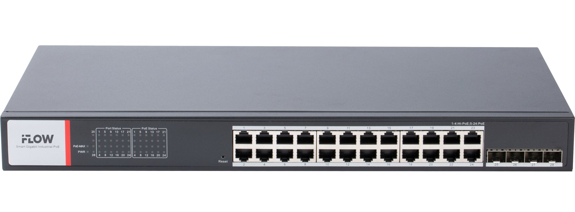 24 × Gigabit PoE Rj45, 4 × Gigabit SFP